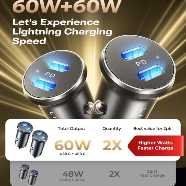 LISEN USB C Car Charger Adapter, 60W Dual Port QC 3.0 Type C Adapter, Car Phone Charger Fast Charge USB C Cigarette Lighter Adapter for iPhone 15 14 13 12 X XS Pro Max Mini, Samsung Galaxy iPad Pro