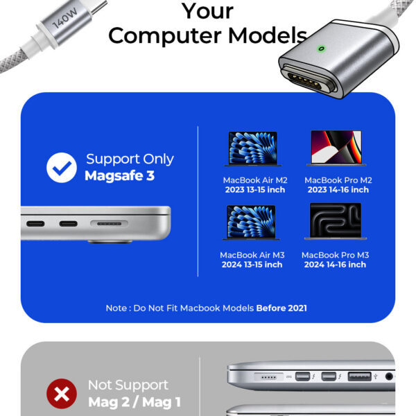 LISEN 140W USB-C Magnetic 3 Cable Fit for MacBook Charger, Nylon Braided 6FT Fit for MacBook Air 2023/2022(M2),MacBook Pro 2023(M3,M2,14-16 inch),MacBook Pro Charger Cord (M3)